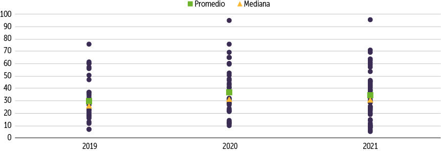 Como se aprecia en el Gráfico V.G1.1, los resultados indican que las instituciones continúan desarrollando sus capacidades para la innovación, con ligeras variaciones interanuales. En la medición de 2021, el 42% de los servicios se situó en la categoría de desarrollo de capacidades "crecientes", lo que significa que han obtenido una puntuación de entre 25 y 50 en la medición. El resultado promedio fue de 33,81 puntos, lo que representa una pequeña disminución de 2,2 puntos en comparación con 2020, pero una mejora de 4,7 puntos en relación con 2019.