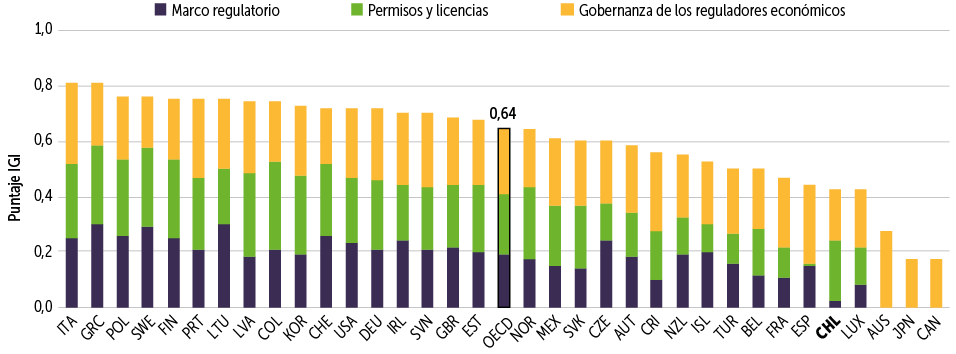 El indicador de infraestructura pública (Infrastructure Governance Indicator, IGI) de 2022 muestra que Chile cuenta con una evaluación de 0,22 puntos en el ámbito de permisos y licenciamientos, lo cual es similar al promedio de los países OCDE (0,21). Junto con esto, en el ámbito de gobernanza de reguladores económicos la evaluación es de 0,18, menor al promedio de los países OCDE (0,24). Sin embargo, la dimensión con mayores oportunidades de mejora es el marco regulatorio, en la que Chile obtiene un puntaje de 0,03, el más bajo de los países medidos y lejos del promedio de 0,19 de la OCDE (Gráfico V.2.2). El marco regulatorio fija las reglas del juego para los sectores y mercados particulares con un amplio impacto en la inversión en infraestructura, además de su desarrollo, mantención y mejora. OCDE agrega que Chile cuenta con iniciativas que permiten promover procedimientos eficientes para la entrega de permisos, por ejemplo, recogiendo datos de forma sistemática sobre sus prácticas y considerando la participación de stakeholders en las distintas etapas.
