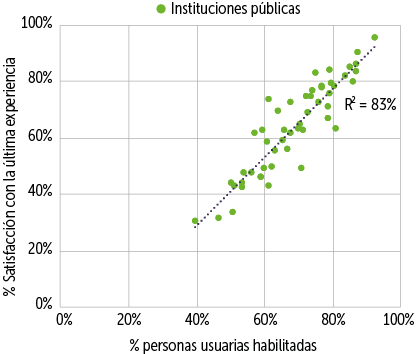 El Gráfico V.C1.3 muestra la relación observada entre el indicador de habilitación y el nivel de satisfacción con la última experiencia de las personas usuarias a nivel institucional, dando cuenta de una fuerte correlación positiva. A medida que las instituciones logran comunicar proactivamente información acerca de los trámites y servicios disponibles, así como los pasos a seguir, requisitos y las respuesta o resoluciones tomadas, las personas tienen más claridad al momento de interactuar con la institución, lo que mejora de forma importante su experiencia.