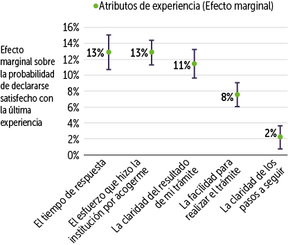 Por su parte, el Gráfico V.C1.4 permite cuantificar el efecto de una evaluación positiva de los atributos de la experiencia, sobre la probabilidad de declararse satisfechos con la última experiencia en 2022. Esta información posibilita a cada institución evaluar qué tan ventajoso es enfocarse en un atributo u otro. Por ejemplo, es interesante notar que, en promedio, una persona que evalúa con nota 6 o 7 “el tiempo de respuesta de la institución” o “el esfuerzo que hace la institución por acogerle” tiene un 13% más de probabilidad de evaluar con tales notas su última experiencia, en comparación a la probabilidad entre quienes califican con tales notas “la claridad de los pasos a seguir”. En conjunto, las variables descritas anteriormente permiten a cada institución identificar espacios de mejora en su servicio, reconociendo grupos de personas en los que enfocarse y canales de atención donde la percepción usuaria es más crítica y requieren de mejoras.