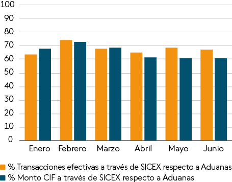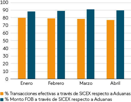 Entre enero y abril de 2024, en promedio, se ha tramitado a través de SICEX el 79% de las exportaciones del país – equivalentes a un promedio de 90% del total de Aduanas en dólares FOB (libre a bordo, por sus siglas en inglés)–; y el 68% de las importaciones del país -equivalentes a un promedio de 68% del total en dólares CIF (costo, seguro y flete, por sus siglas en inglés)- (Gráfico III.2.1.1 y Gráfico III.2.1.2).