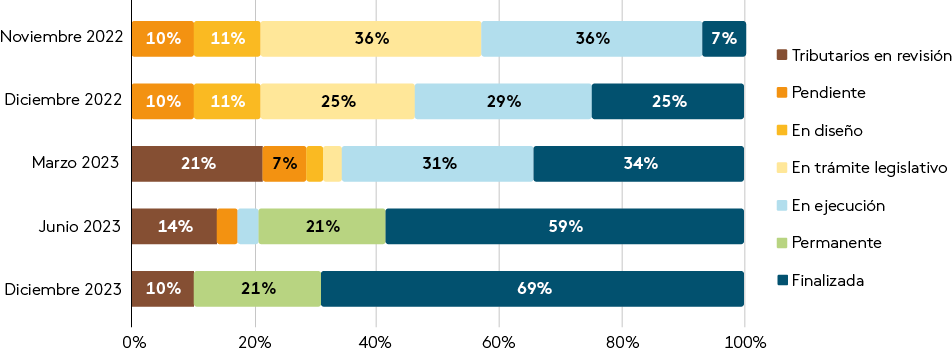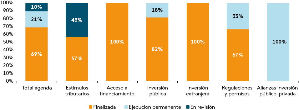 Las medidas se organizaron en seis ejes: estímulos tributarios, acceso al financiamiento, mejora de la inversión pública, promoción de la inversión extranjera, eficiencia en regulaciones y permisos, y alianzas público-privadas. Entre los logros destacados se encuentra la priorización de proyectos con alto encadenamiento productivo en la Ley de Presupuestos 2024 y el fortalecimiento de InvestChile para atraer inversión extranjera. El seguimiento del Plan mostró que el 69% de las medidas fueron finalizadas y el 21% se encuentra en ejecución permanente (Gráfico III.1.1.2).