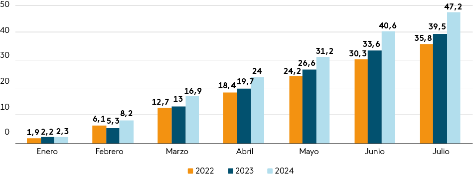 Al desglosar este avance destaca el desempeño de la inversión pública, que a julio registró un avance sobre la Ley aprobada de 40,9%, la más alta desde 2019. Respecto de julio del año pasado la inversión acumulada registró un crecimiento anual de 29,4%.