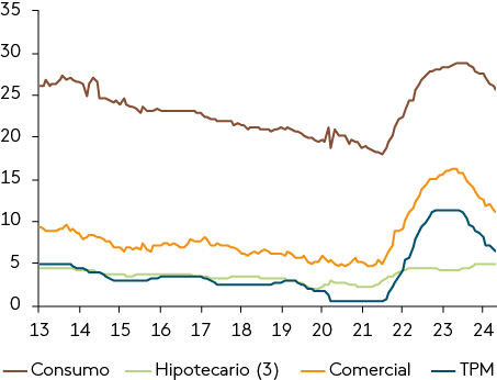 El fortalecimiento de las infraestructuras financieras sigue siendo una prioridad. La implementación de Basilea III, que introduce nuevos requerimientos de capital y reservas para los bancos, refuerza la estabilidad del sistema financiero. A partir del 1 de diciembre de 2024, el requerimiento de capital básico adicional, relacionado con el colchón de conservación de capital, alcanzará su valor en régimen de 2,5%. Además, la sustitución de capital nivel 2 (T2) por capital adicional nivel 1 (AT1) alcanzará el 1,5%[17], y el cargo adicional para bancos sistémicamente importantes llegará al 75% del total, mientras que el descuento de capital ascenderá al 65%. La CMF también ha aplicado requerimientos adicionales de capital según el Pilar 2, los cuales debían constituirse en un 25% antes del 30 de junio de 2024. Los ejercicios de tensión bancaria muestran que el sistema financiero chileno sigue siendo resiliente, con niveles adecuados de liquidez, provisiones y capital. A medida que se continúe implementando Basilea III se estima que los bancos enfrentarán mayores exigencias de capital, por lo que deberán seguir fortaleciendo sus bases[18].