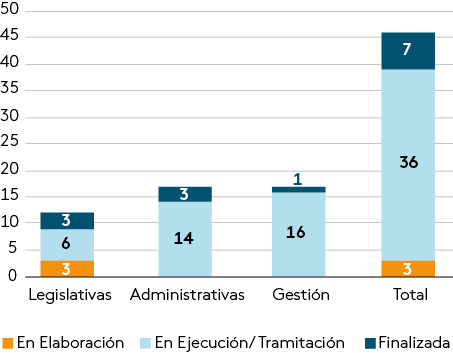 Hasta julio de 2024, se habían completado siete medidas, incluyendo leyes publicadas, actos administrativos y medidas de gestión. Entre los avances más destacados está la movilización de recursos de inversionistas institucionales hacia capital de riesgo, la promulgación de la Ley N° 21.666, en abril de 2024, que moderniza el Sistema Nacional de Certificación de Competencias Laborales, y la expansión de los programas de capacitación en competencias digitales, que financiarán más de cinco mil becas en 2024. Otras medidas en curso incluyen mejoras en el Sistema Integrado de Comercio Exterior (SICEX) y avances en digitalización, como el fortalecimiento de la clave única (Gráfico III.1.1.3).