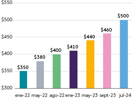 El 1 de julio de 2024 el Ingreso Mínimo Mensual (IMM) aumentó hasta los $500 mil para las personas trabajadoras entre 18 y 65 años, según lo establecido en la Ley N° 21.578, publicada en mayo de 2023, cumpliendo uno de los compromisos del programa de Gobierno del Presidente Boric.