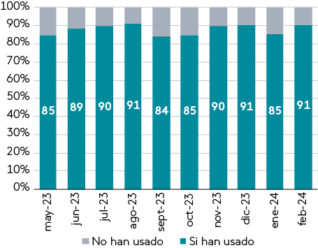 El Banco Mundial, a través de su programa “Government to People” (G2Px), realizó una evaluación del BFE, destacando su alta tasa de uso, con un 95% de las personas beneficiarias utilizando el subsidio al menos una vez (Gráfico VI.1.6). El informe también subrayó que el BFE facilitó el acceso a comercios locales, beneficiando tanto a pequeños negocios como a los hogares vulnerables. La facilidad de uso de la CuentaRUT, la penetración de la aplicación de BancoEstado y el alto porcentaje de mujeres beneficiarias (84%) fueron otros aspectos positivos mencionados. Además, se identificó que el BFE contribuyó a mejorar las capacidades financieras de los hogares, fomentando mejores hábitos de planificación y ahorro.