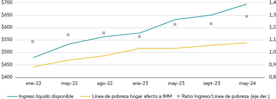 Nota: De acuerdo a la encuesta Casen 2022, un hogar promedio que tiene al menos un trabajador afecto a salario mínimo está compuesto por 3,4 integrantes, de los cuales 1,2 son trabajadores afectos a salario mínimo y 1,5 son causantes de la asignación familiar. Valores del Ingreso Mínimo Garantizado son calculados en base al valor promedio efectivo entregado por trabajador, según lo reportado por el Ministerio de Desarrollo Social y Familia.