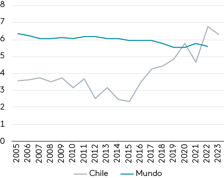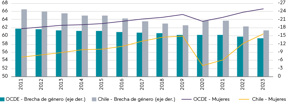 La participación laboral femenina ha mostrado una importante recuperación desde 2022, alcanzando un récord histórico del 60,5% en 2023 (Gráfico VI.2.1). Sin embargo, persiste una brecha significativa en comparación con la participación masculina (77,6%) y el promedio de la Organización para la Cooperación y el Desarrollo Económico (OCDE) (66,6%). Aumentar esta participación puede incrementar la oferta laboral y la productividad en los distintos sectores económicos del país.