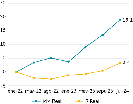 El aumento del IMM a $500 mil completó una serie de seis incrementos graduales desde mayo de 2022 hasta julio de 2024, acumulando un alza de 19,1% real entre enero de 2022 y julio de 2024 (Gráfico VI.1.1). Comparativamente, se observa que la evolución del ingreso mínimo real se ha situado por sobre la variación de 3,4% del Índice de Remuneraciones (IR) real en el mismo periodo (Gráfico VI.1.2).