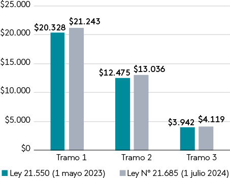 Estas medidas se incorporaron en la Ley N° 21.685 que Reajusta los valores del SUF y la AF, otorga un aporte pagado a través del BFE por los meses de invierno de 2024 e inyecta recursos al Fondo de Estabilización de Precios del Petróleo, que fue publicada el 13 de julio de 2024. De esta forma, a contar del 1 de julio de 2024, los montos y tramos de la AF quedaron establecidos de acuerdo con los siguientes valores (Gráficos VI.1.3 y VI.1.4):