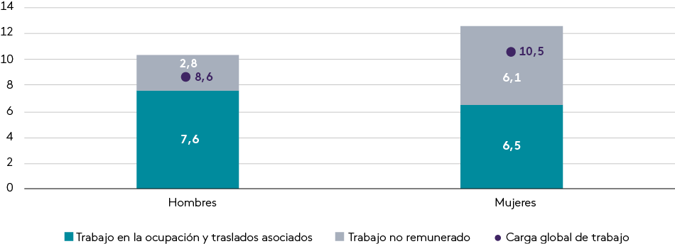 NOTA: La carga global de trabajo es el promedio de tiempo destinado a todas las actividades de trabajo sobre el universo de las personas que realizan algún tipo de trabajo. Esta estimación no equivale necesariamente a la suma los promedios de tiempo destinados al trabajo en la ocupación y trabajo no remunerado; cada uno se calcula sobre su propio universo de participantes, el que puede variar respecto de la carga global de trabajo, ocupación y trabajo no remunerado.