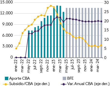 A través de la Ley N° 21.550, publicada en marzo de 2023, el BFE operó inicialmente entre mayo y diciembre de 2023, asignando $13.500 mensuales por cada causante dentro del hogar. Este monto permitió cubrir más del 20% del valor total de la Canasta Básica de Alimentos (CBA) (Gráfico VI.1.5). La extensión de este beneficio hasta septiembre de 2024, bajo la Ley de Presupuestos del Sector, reafirma su relevancia en la política social del Gobierno, ofreciendo una mayor seguridad económica a más de 1,6 millones de hogares en situación de vulnerabilidad.