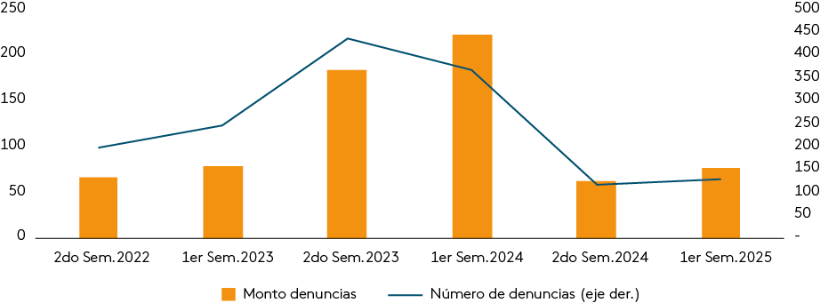 Por otra parte, la reforma a la Ley de Fraudes (Ley N° 20.009), mediante la publicación de la Ley N° 21.673, produjo una significativa reducción de los reclamos por transacciones no reconocidas y del fenómeno del “autofraude”, especialmente en BancoEstado, donde los casos pagados cayeron drásticamente en menos de un año. A nivel general, las denuncias por fraudes cayeron un 73% en el primer semestre de 2024 respecto al año anterior, pasando de 434 mil denuncias hasta 116 mil (Gráfico III.3.2.1). Esto se logró al exigir que toda solicitud de devolución de fondos estuviera respaldada por una denuncia formal y una declaración jurada, desincentivando abusos y facilitando la identificación de fraudes intencionales. Además, se acortaron los plazos para reportar operaciones desconocidas y se establecieron criterios más estrictos y ágiles para la restitución de fondos.