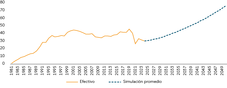 Este fortalecimiento del ahorro nacional tiene múltiples repercusiones positivas para la economía. Por un lado, aumenta el stock de recursos disponibles para financiar inversiones, facilitando la canalización de fondos hacia proyectos productivos de largo plazo, infraestructura y desarrollo tecnológico. De acuerdo con proyecciones realizadas por la Dirección de Presupuestos, en las próximas dos décadas el total de los activos ahorrados en el mercado local se incrementará en aproximadamente diez puntos porcentuales del PIB en comparación con un escenario sin la aprobación de esta reforma, acercándose a un 80% del PIB hacia el año 2050 (Gráfico III.3.2.2). Esta acumulación de activos financieros contribuirá, además, a dinamizar el mercado de capitales y profundizar los instrumentos disponibles, promoviendo la competencia, la innovación y una mejor asignación de los recursos.