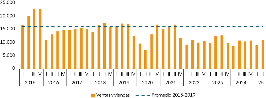 De acuerdo con la Cámara Chilena de la Construcción (CChC), el promedio de viviendas vendidas entre 2015 y 2019 fue de 16.171 unidades por trimestre, mientras que desde 2022 este promedio ha bajado en casi dos tercios, hasta 10.443 unidades por trimestre, aunque con un repunte en el segundo trimestre tras el efecto del subsidio a la tasa de interés hipotecaria (Gráfico III.3.1.1).