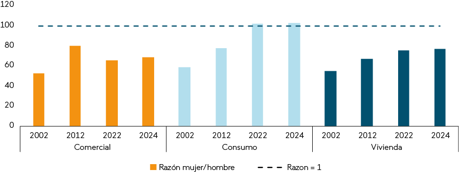 En lo que respecta al crédito, a pesar de la contracción crediticia general, el acceso por parte de las mujeres ha mostrado avances sostenidos en los últimos años. Desde 2002 hasta 2024, la proporción de mujeres en el sistema bancario ha aumentado significativamente, alcanzando la paridad e incluso superando a los hombres en número de deudoras en créditos de consumo (103 mujeres por cada 100 hombres en 2024). Sin embargo, en créditos comerciales y de vivienda, las mujeres siguen estando subrepresentadas: en 2024 hay 69 mujeres deudoras por cada 100 hombres en créditos comerciales, y 77 en créditos hipotecarios, lo que refleja una menor participación femenina en estos segmentos (Gráfico III.3.1.4).
