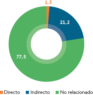 A partir de los resultados del proceso de etiquetado de género, se identificó que un 22,5% de la Ley de Presupuestos vigente en 2025 contribuye a la igualdad de género. Este porcentaje equivale a un 36% de las 768 asignaciones y subasignaciones etiquetables para el ejercicio presupuestario y suma $18.594.109 millones distribuidos en 22 ministerios. De ese total, 1,31% tiene una contribución directa, mientras que 21,2% aporta indirectamente a la igualdad de género (Gráfico IV.B.1).