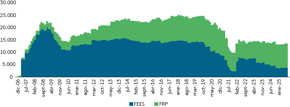 Desde su inicio, el 6 de marzo de 2007, hasta el último reporte de ejecución disponible al cierre estadístico de este informe, junio de 2025, el FEES ha recibido aportes por US$ 27.763 millones. Los últimos aportes se realizaron en enero y marzo de 2022, por un total de US$ 5.998 millones. Estos aportes permitieron que el Fondo recuperara en parte su tamaño después de alcanzar su valor mínimo, desde su inicio, en diciembre de 2021 por US$ 2.457 millones. Por otro lado, los últimos retiros al fondo se efectuaron en enero de 2024 por US$ 800 millones y en octubre de 2024 por US$ 1.000 millones, ambos para apoyar la ejecución presupuestaria, y en junio de 2024 por US$ 607 millones, para financiar el aporte anual al FRP.