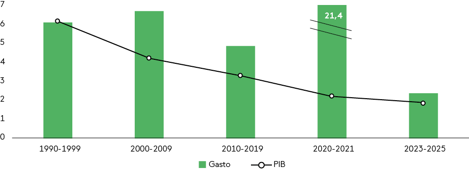 NOTA: Gastos e ingresos de Gobierno corresponde a total de Gobierno Central. Tasas de crecimiento corresponden al creci- miento anualizado por período. Se excluye 2022 del cálculo de gasto porque fue un año de ajuste fiscal con un retroceso del gasto de 23% real anual. Para 2025 se asume proyección de crecimiento de PIB y gasto en IFP 3T2025.