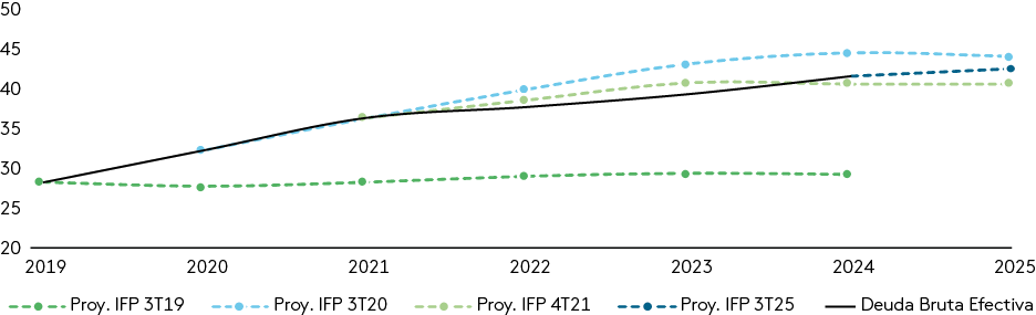 Todo lo anterior se puede visualizar en el Gráfico IV.1.3, que muestra la evolución efectiva de la deuda bruta cada año, así como las proyecciones que se hicieron antes, para compararlas con las actuales.