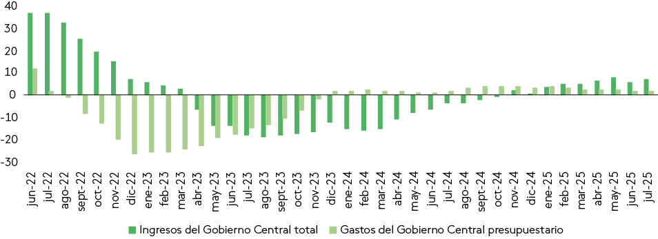 El 2025 ha mostrado un claro mejoramiento en la dinámica de ingresos y gastos para la sostenibilidad fiscal. Por un lado, los ingresos del Gobierno Central crecieron 6,9% anual para el año móvil terminado en julio de 2025; y por otro, los gastos del Gobierno Central Presupuestario crecieron solo al 1,8%, medidos de la misma manera. Es decir, los ingresos crecieron cinco puntos porcentuales por sobre los gastos.