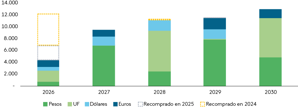 Durante 2024, este programa se ejecutó exitosamente, alcanzando un total de recompras por US$ 10.800 millones aproximadamente. En 2025 la estrategia se ha mantenido, enfocándose principalmente en los vencimientos del año 2026, de los cuales se logró recomprar US$ 2.600 millones. De este modo, se ha conseguido reducir las amortizaciones proyectadas para el próximo año, las que totalizan, al cierre de julio, US$ 4.300 millones (Gráfico IV.3.1.1).