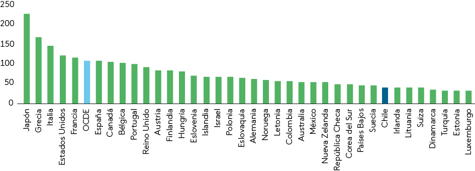 En 2024 la relación deuda pública sobre PIB de Chile cerró en 41,7%, nivel que se mantuvo constante al primer trimestre de 2025. Esta cifra posiciona a Chile en el lugar 8 entre los 38 países miembros de la Organización para la Cooperación y el Desarrollo Económico (OCDE), consolidándose como uno de los niveles más bajos del grupo (Gráfico IV.3.1.2). Mientras muchas economías avanzadas exhiben ratios cercanos o superiores al 100% del PIB, el promedio OCDE alcanzó 110,5% en el mismo período. En contraste, Chile ha contenido su deuda en torno al 42%, reflejando una trayectoria fiscal prudente y sostenida. Esta posición favorable responde, en parte, a un marco institucional que ha priorizado la sostenibilidad fiscal y el manejo responsable del endeudamiento soberano, lo que distingue a Chile positivamente en el contexto internacional.