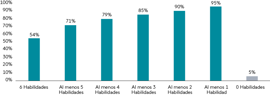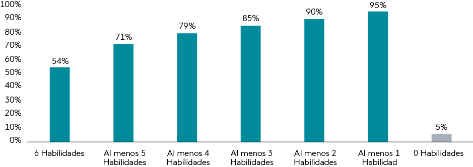En noviembre 2024 se presentó el Primer Índice de Ciudadanía Digital, elaborado por Fundación País Digital con el apoyo de Entel y la colaboración de la SGD, que entregó un diagnóstico inédito sobre las habilidades y prácticas digitales de la población. El estudio reveló que el 95% de las personas posee al menos una habilidad digital básica (Gráfico VI.2.1.1) y que el 81% utiliza internet para siete o más actividades esenciales. Asimismo, 95% ha habilitado su ClaveÚnica, un nivel alto y consistente en todos los grupos etarios y socioeconómicos, reflejando avances en la modernización y adopción de trámites digitales. La medición, que considera dimensiones como conocimientos y habilidades, usos de internet, ciberseguridad, buenas prácticas en línea y participación cívica en línea, sirve de base para diseñar programas específicos que reduzcan brechas y potencien el uso de herramientas emergentes como la inteligencia artificial, contribuyendo a una ciudadanía más preparada para la transformación digital.