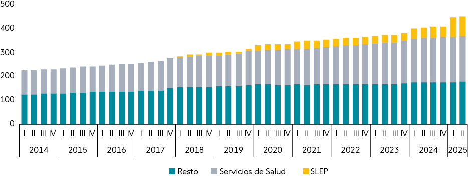 Desde el inicio de la actual administración, obviando el personal de los SLEP y el reforzamiento en salud, el empleo en el Gobierno Central aumentó en promedio tres mil personas al año, la mitad que el promedio prepandemia. En relación al cambio total desde marzo del 2022, el personal permanente del Gobierno Central se ha incrementado en un 26%, correspondiente a 93.368 personas. Por un lado, 56% de este incremento se explica por el personal de los SLEP que han entrado en funcionamiento en el período, así como el traspaso gradual de personal de establecimientos educacionales desde los municipios a los SLEP, incorporándose así a las estadísticas de Gobierno Central. De este personal, cerca de un 95% corresponde a traspasos de personal de establecimientos educacionales que se incorporan a las estadísticas del Gobierno Central, y por tanto, se ven reducidos en la dotación de las municipalidades. Se espera que este grupo continúe incrementándose hasta llegar a aproximadamente 254 mil funcionarios a 2028, cuando finalice la puesta en marcha de los servicios locales de educación.