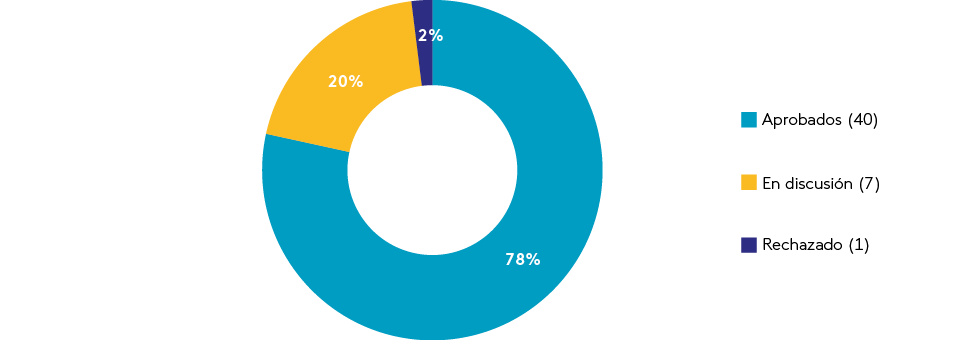De los 51 proyectos de ley ingresados a tramitación por este ministerio, el 78% ha sido aprobado y despachado a Ley (Gráfico VIII.1). A su vez, estos proyectos representan un 36% de los 110 proyectos de Ley que han sido ingresados por esta administración y aprobados por el Congreso Nacional, destacando la efectividad y acogida que ha tenido esta cartera en la tramitación de iniciativas de su competencia.
