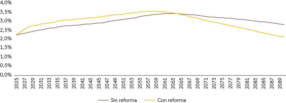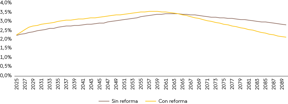 La Ley N° 21.735 incrementa el monto de la PGU a $250 mil a partir de septiembre de 2025, según la edad de los beneficiarios. Su aprobación, que incluye entre otras medidas un aumento del componente de capitalización individual, mediante una cotización adicional de 6% de cargo del empleador, permite contener en el largo plazo la presión fiscal del pilar no contributivo (Gráfico VII.1.1.2), tal como se ha analizado en estudios de la Dirección de Presupuestos (Dipres).