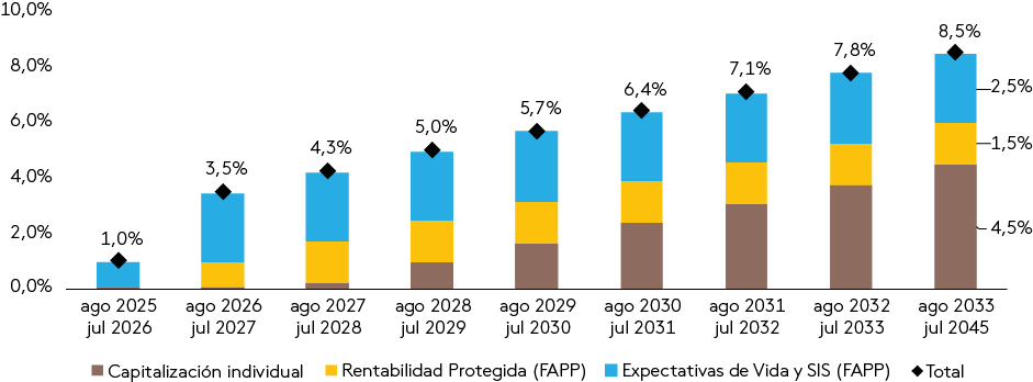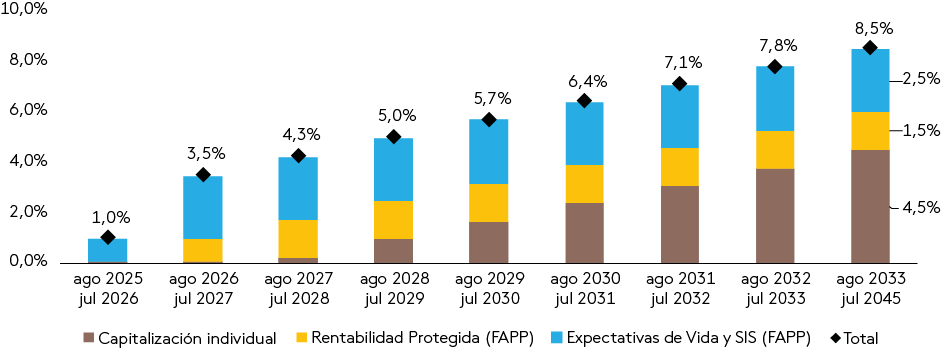 - Aumento de la tasa de cotización de cargo del empleador: La Ley incrementa en 7 puntos porcentuales la cotización para el financiamiento de pensiones de vejez, de cargo de los empleadores, en un plazo de nueve años (Gráfico VII.1.1.1), que puede extenderse a once años dependiendo de los niveles de recaudación fiscal que se obtengan de la Ley N° 21.713, publicada el 24 de octubre de 2024, que Dicta normas para asegurar el Cumplimiento de las obligaciones tributarias dentro del Pacto por el Crecimiento Económico, el Progreso Social y la Responsabilidad Fiscal. Estos 7 puntos adicionales de cotización a cargo del empleador se distribuirán de la siguiente manera: 4,5% a las cuentas individuales de los trabajadores, 1,5% al Aporte Diferido con Rentabilidad Protegida – que financiará beneficios adicionales por cada año cotizado -, y 2,5% al Seguro de Invalidez y Sobrevivencia (SIS) que ya existe, e incluye (1%) para una compensación para las mujeres por su mayor expectativa de vida.