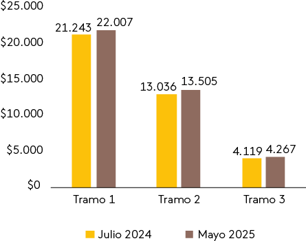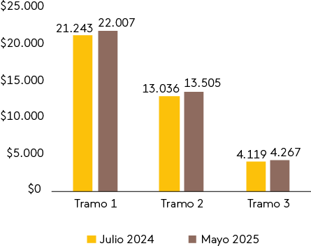 La Ley N° 21.751 también incorporó otras disposiciones orientadas a apoyar a los hogares y personas trabajadoras de menores ingresos frente al aumento del costo de vida. Con este propósito, se estableció un reajuste de 3,6% de los tramos y montos de la AF y la Asignación Maternal, con lo cual a partir del 1 de mayo de 2025 estos quedaron definidos a partir de los siguientes valores (Gráfico VII.1.2.1 y VII.1.2.2):