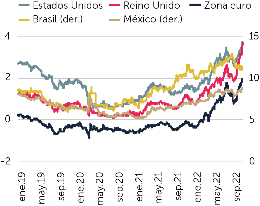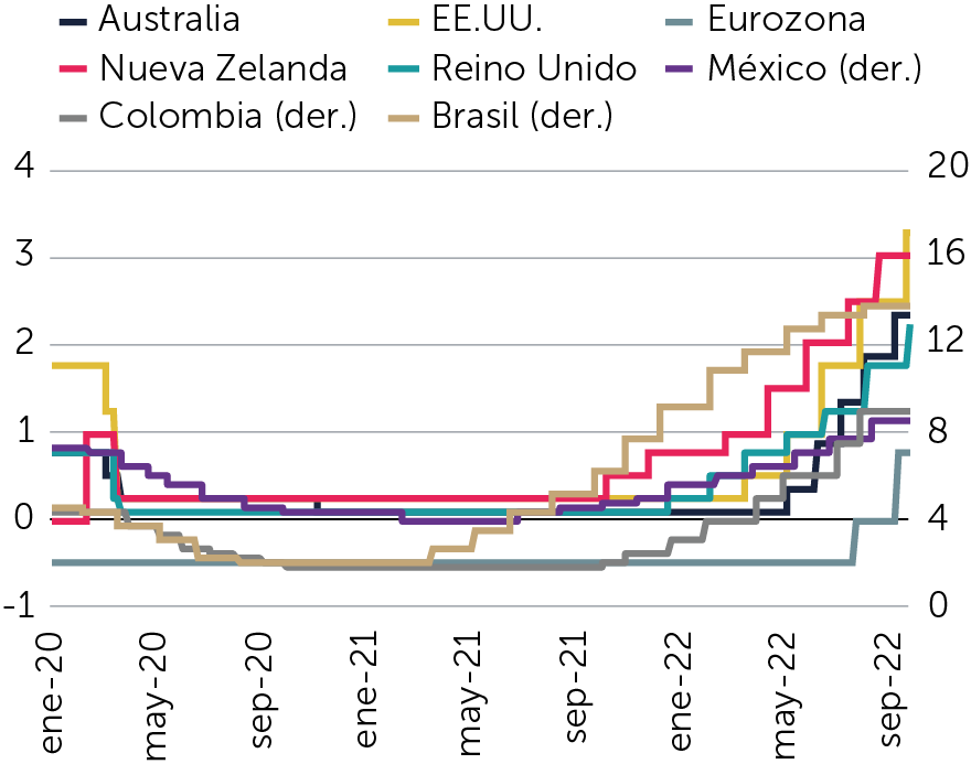 Las elevadas tasas de inflación llevaron a que los bancos centrales comenzaran o continuaran con una significativa contracción monetaria. De esta forma, el ajuste monetario ha continuado, tanto en economías emergentes, que comenzaron el alza de sus tasas de interés de referencia durante 2021, como en las avanzadas, que, en su mayoría, iniciaron alzas de tasas durante este año. En lo que va de 2022, Estados Unidos ha aumentado su tasa de interés de política monetaria (TPM) en 300 puntos base (pb.), la Zona Euro en 125 pb. y el Reino Unido en 200 pb. En Latinoamérica, en tanto, Brasil ha incrementado su TPM en 450 pb., Colombia en 600 pb., Perú en 425 pb. y México en 300 pb (Gráfico I.4). Las expectativas, a su vez, apuntan a más alzas de tasas en lo que queda del año.