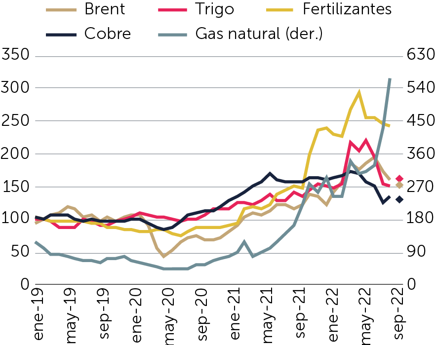 Nota: Precio del gas natural corresponde a un índice calculado por el Banco Mundial a partir del precio de EE.UU., Europa y Japón. Marcador en el precio del brent, del cobre y del trigo representa el promedio de septiembre hasta el día 23 del mismo mes.