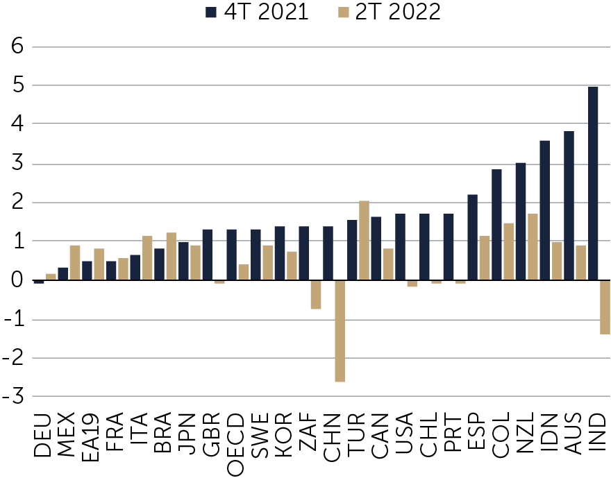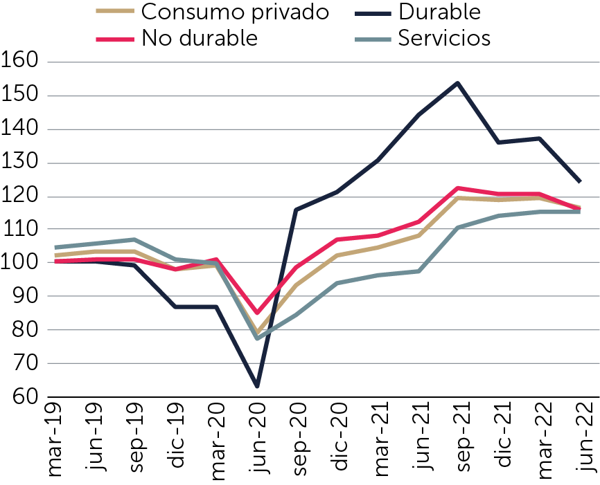 El consumo privado fue más resiliente de lo esperado en el primer trimestre, pausando su caída desde el peak del tercer trimestre de 2021, para luego volver a su tendencia a la baja en el segundo trimestre con un decrecimiento de 2,4% ligado principalmente a una fuerte caída de 9,5% trimestral del consumo de bienes durables. El consumo de bienes no durables también se ha ajustado a la baja, mientras que el consumo de servicios continúa recuperándose de las restricciones impuestas por la pandemia del Covid-19 (Gráfico I.10).