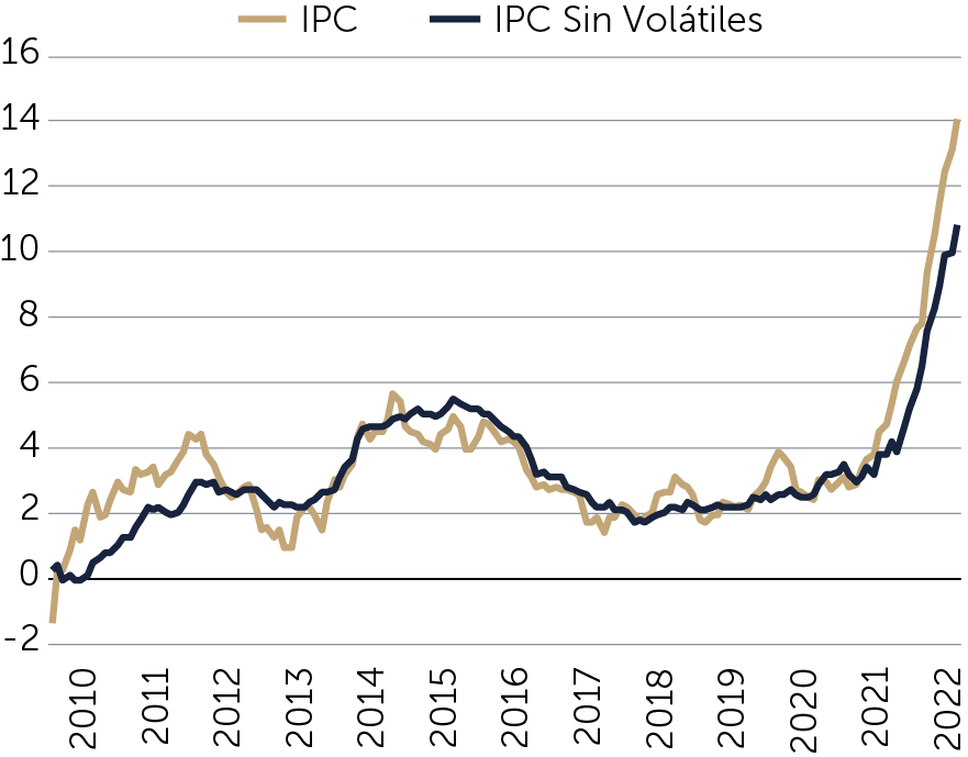 La elevada inflación se ha transformado en un fenómeno de preocupación. A las presiones de demanda interna en Chile, se sumaron con mayor fuerza factores externos: un shock en los precios de materias primas, fundamentalmente combustibles y alimentos y, la continua disrupción en la cadena global de suministros. La combinación de estas fuerzas contribuyó a que la inflación total del país llegara a un 14,1% interanual en agosto de este año. Por su parte, el registro de la inflación subyacente, que excluye los productos más volátiles, ha llegado a 10,8% en 12 meses, escalando hacia valores históricamente altos (Gráfico I.11). Por otra parte, las expectativas de inflación comenzaron a desanclarse de la meta de 3% del Banco Central desde mediados del año pasado, ubicándose en 3,8% a dos años en la última Encuesta de Expectativas Económicas de septiembre.