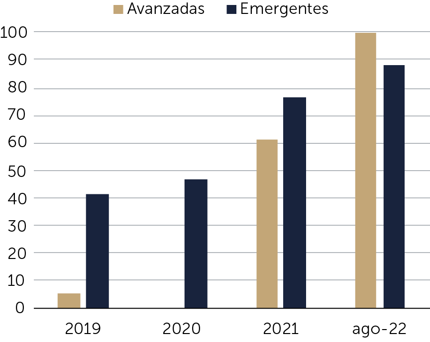 Los gobiernos han tomado diversas medidas para mitigar el impacto del aumento en los precios de energía y alimentos, así como para velar por la seguridad alimentaria. Según una encuesta del FMI (Fondo Monetario Internacional) a 134 países, a marzo de este año 71 países -algo más de la mitad- habían anunciado al menos una medida para limitar el traspaso de mayores precios internacionales a los consumidores. De las economías avanzadas encuestadas (31 países), un 84% había anunciado al menos una medida, mientras que de las economías emergentes y en desarrollo (103 países), esta proporción descendía al 44%[3]. En términos de seguridad alimentaria, en tanto, según el Banco Mundial, hasta mediados de septiembre, 21 países han implementado prohibiciones a la exportación de alimentos, mientras que seis han establecido medidas de restricción de las exportaciones[4].