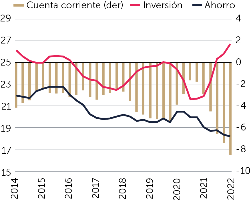 La cuenta corriente continuó deteriorándose durante el año, llegando a acumular en el segundo trimestre un déficit de 8,5% del PIB (Gráfico I.17). Este deterioro tiene que ver con el alto nivel de consumo privado junto con el empeoramiento de los términos de intercambio y un peor balance de servicios determinado por altos costos de transporte y bajos ingresos por turismo. Este alto déficit, financiado principalmente por inversión extranjera directa, refleja el persistente impacto de los desequilibrios del año pasado por retiros de pensiones y las medidas de estímulo fiscal, el cual se irá ajustando a medida que la economía se vaya normalizando.