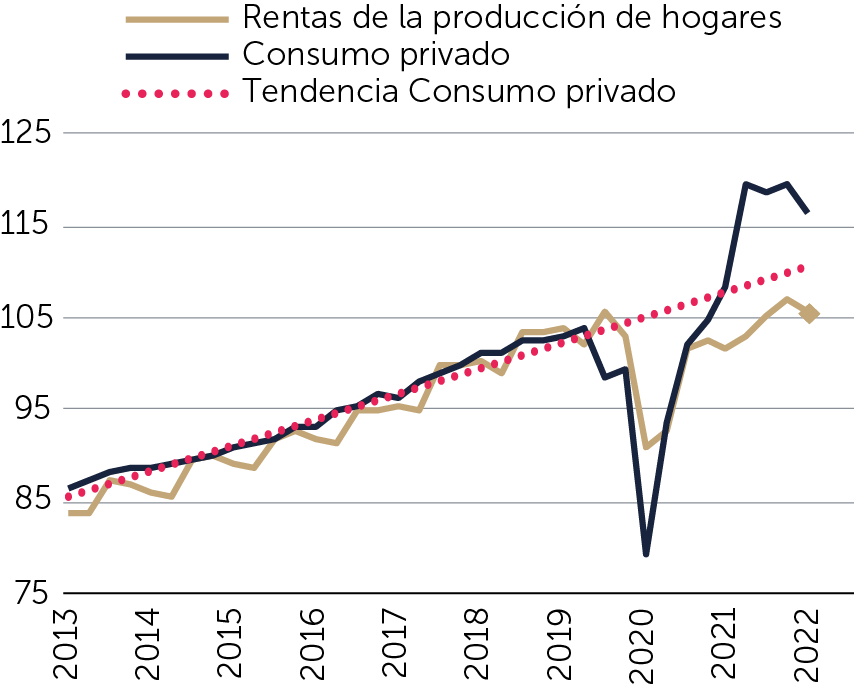 Se espera que la economía continúe este año con el proceso de ajuste necesario ante los desequilibrios generados en los años previos. Las expectativas de ventas del sector comercio, medidas a través del Indicador Mensual de Confianza Empresarial (IMCE), continúan en terreno marcadamente pesimista ante fundamentos del consumo privado que apuntan a un importante deterioro. La liquidez de los hogares se ha reducido de manera significativa, con lo que se estima que, tras la elevada expansión de cerca de 20% anual en 2021, durante la segunda mitad del año el consumo privado se desacelerará hacia niveles coherentes con los ingresos del trabajo de los hogares (Gráfico I.18), hasta alcanzar niveles en línea con su tendencia hacia el cuarto trimestre. A lo anterior, se suma una importante caída en la variación anual de los salarios reales, así como condiciones crediticias menos favorables para los créditos de consumo, conforme se traspasan las alzas en la tasa de interés de referencia.