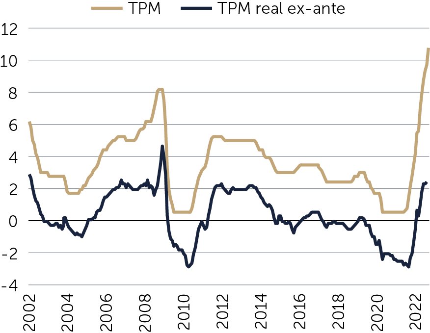 El Banco Central actuó de manera rápida ante el alza de la inflación. A mediados del año pasado, el Banco Central inició el proceso de normalización de la política monetaria incrementando su tasa de referencia hasta llevarla a 10,75% en su última reunión de septiembre (Gráfico I.13). Con esta decisión, la TPM estaría ubicada en torno su nivel máximo según el ente emisor, y los próximos movimientos de la tasa dependerán de la evolución del escenario macroeconómico. Por otro lado, la inusualmente alta volatilidad e intensidad de la depreciación del peso en julio comenzó a tensionar la formación de precios del mercado cambiario amenazando con generar distorsiones significativas en el funcionamiento del mercado financiero en general. Lo anterior llevó al ente emisor a realizar un programa de intervención cambiaria que apoyó, en parte, una caída del tipo de cambio de alrededor de 170 pesos a un mes desde su anuncio.