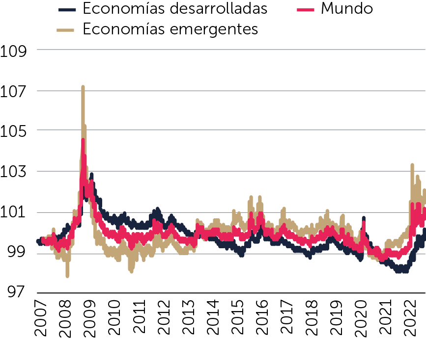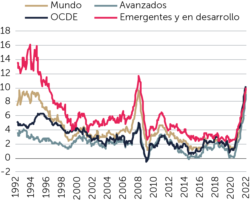 Nota: En base a 18 países avanzados y 17 emergentes. Barras representan el desvío de la inflación respecto a la meta. Metas de acuerdo con la información de Bloomberg. En el caso de que la meta sea un rango, se utiliza el punto medio de este. Para los datos anuales, se utiliza el promedio de las variaciones anuales de cada año.