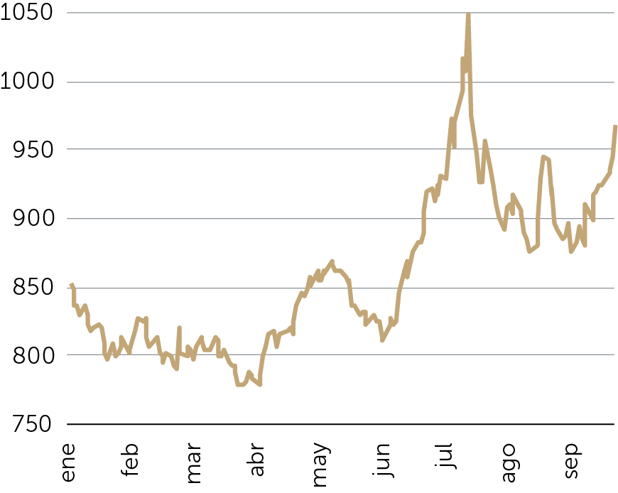 La depreciación del peso chileno ha sido otra fuente de presión sobre la inflación. La moneda se ha debilitado tanto por sus determinantes —caída del precio del cobre, condiciones financieras globales más restrictivas, y la apreciación del dólar global— como por el deterioro de la cuenta corriente y el nivel de incertidumbre interna, llegando a un máximo histórico de $1.051 en julio, para luego revertirse y ubicarse bajo los $900 a fines de agosto y las primeras semanas de septiembre. En las últimas semanas de septiembre, por otra parte, el tipo de cambio ha vuelto a depreciarse, promediando $945 en la penúltima semana del mes (Gráfico I.12). Los peores términos de intercambio y el alto déficit de cuenta corriente han incidido también en un tipo de cambio real que se encuentra en máximos desde principios de 1990. En cuanto a los mercados financieros locales, durante lo que va del año, la tasa base a diez años ha tenido un comportamiento (+100 pb) más moderado que la de EE.UU. (que comenzó el año en 1,5% para superar el 3,7% luego de la reunión de septiembre de la Reserva Federal), y la Bolsa chilena ha tenido un positivo rendimiento (+20%), superando al S&P500 (-18,7%).