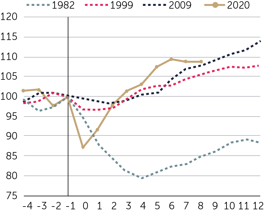Nota: T=0 en periodos 4T1981, 4T1998, 4T2008, 2T2020. Las series oficiales desestacionalizadas fueron empalmadas para todos los periodos, excepto 1982-1983. Para ese periodo se desestacionalizó la serie “Indicadores Sociales y Económicos 1960-1988”.