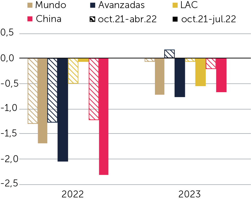 La economía mundial se ha desacelerado de la mano de peores fundamentos. La actividad global se ha debilitado en lo que va del año (Gráfico I.7), afectada principalmente por (i) los efectos colaterales de la invasión de Rusia a Ucrania, (ii) los confinamientos en China producto de sucesivos brotes de Covid-19, (iii) altos niveles de inflación y (iv) el consecuente endurecimiento de la política monetaria a nivel global, que a su vez ha gatillado condiciones financieras más restrictivas. En línea con esto, las perspectivas para el crecimiento mundial de 2022 y 2023 se han deteriorado significativamente en lo que va del año (Gráfico I.8).
