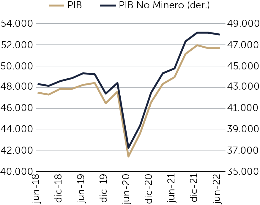La actividad económica ha iniciado un proceso de ajuste necesario tras el recalentamiento de fines de 2021, convergiendo hacia niveles más compatibles con el de tendencia. Luego de haber crecido 11,7% el 2021, el PIB ha seguido un proceso de normalización, decreciendo 0,6% en su serie trimestral desestacionalizada en el primer trimestre y teniendo una variación nula en el segundo. Por el lado del PIB No Minero si bien creció 0,1% en los primeros tres meses del año registró una caída de 0,5% en el segundo trimestre (Gráfico I.14). La demanda interna, a su vez, cayó 0,6% y 0,9% en el primer y segundo trimestre, respectivamente.