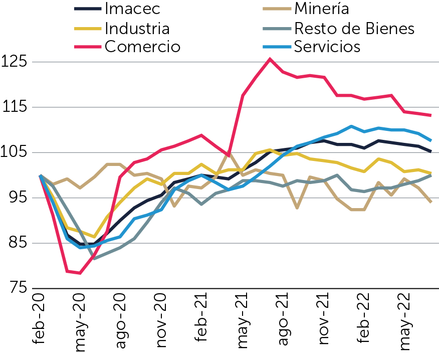 Por el lado de la oferta, la mayoría de los sectores ha estancado su crecimiento durante el año. Minería se ha visto afectada por problemas puntuales, mantenciones, menores leyes y, en algunos casos, por menor disponibilidad de agua. La industria ha caído en el margen acercándose a sus niveles previos a la pandemia. Los servicios han desacelerado pausando su recuperación durante este año. Finalmente, el comercio continúa con un notorio ajuste desde los máximos de mediados del 2021 cuando llegó a ubicarse 25% sobre los niveles previos a la crisis, ante perspectivas pesimistas dada una evolución a la baja de los fundamentos del consumo privado (Gráfico I.16).