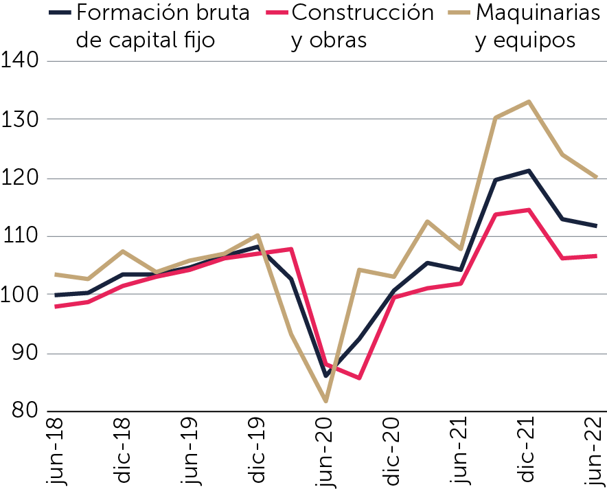La inversión, al contrario, cayó fuertemente el primer trimestre para luego estabilizarse. Las importaciones de maquinaria y equipos han mostrado una desaceleración paulatina, mientras que el componente construcción y obras ha tenido un comportamiento más mixto sin caer en el segundo trimestre debido a proyectos de gran envergadura centrados en obras de ingeniería (Gráfico I.15), pero con perspectivas negativas en el mediano plazo. La inversión pública, por su parte, ha tenido un lento dinamismo, registrando una tasa de ejecución acumulada a julio menor a la de años anteriores, debido a la escasez de materiales y el aumento de costos (ver Capítulo II).