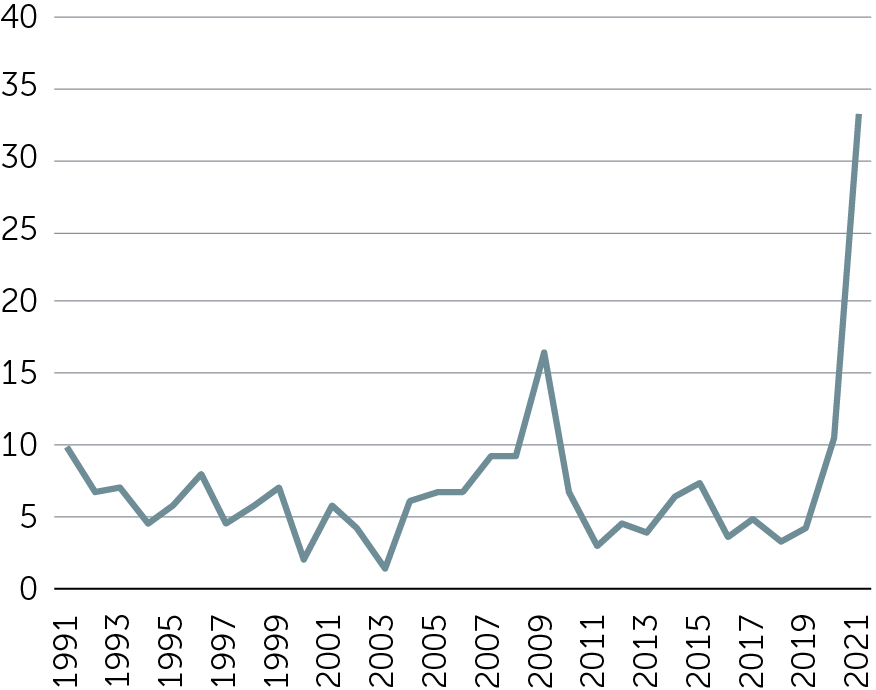 La crisis del Covid-19 gatilló esfuerzos fiscales sin precedentes. En Chile, la mayor expansión del gasto se realizó a fines de 2021. Los últimos dos años fueron particularmente desafiantes para la política fiscal a nivel mundial. La pandemia ocasionada por el Covid-19 no sólo gatilló una crisis sanitaria mundial, sino que también tuvo un fuerte impacto económico. Para hacer frente a esta crisis, los países tuvieron que realizar importantes esfuerzos fiscales para fortalecer los sistemas de salud y mitigar los impactos económicos sobre las personas y empresas. Chile no fue la excepción y entre 2020-21 el gasto fiscal transitorio[3] asociado a medidas Covid-19[4] alcanzó cerca de US$ 40 mil millones, de los cuales las masivas transferencias realizadas a los hogares (bonos y subsidios) contabilizaron cerca de US$ 35 mil millones[5]. Con todo, en el contexto de la pandemia, 2021 fue el año de mayor expansión histórica del gasto fiscal del Gobierno Central (Gráfico II.2), en el que alcanzó un histórico crecimiento real de 33,4% a/a (un gasto total de 31,5% del PIB).